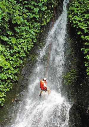 突然,前面断了去路,悬崖像张开大嘴的怪兽,几位男同志壮了壮胆伸头一看,却不见底,不由得心头一惊。再看,靠近我们一侧的悬崖往里内陷,还是不见崖底,只听水声阵阵。什么,从这里下到崖底?听教练这么一说,很多人露出害怕或担心的表情,教练赶紧安慰:只有10米高,不要紧,有我们保护,不会有危险,你们挑战自我的机会来了。