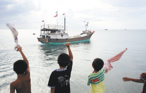 | 8月1日,几名渔家孩子挥别出海捕捞作业的临高渔船。 本报记者 苏晓杰 摄 |