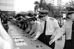 | 世界知识产权日活动上,相关政府部门工作人员及群众在宣传条幅上签名。 |