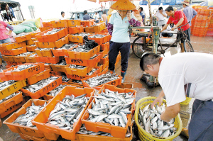 8月2日,南海伏季休渔期结束的第二天,在近海作业的渔船,早早回到了三亚渔港码头,捞回了一船船鱼货。当天,记者在渔港码头看到,这里又恢复了往日的热闹,鱼贩们蜂拥而来,争着购买鱼货;一辆辆泠藏车排满了码头,工人们将鱼货打包,装车后运往岛外远销。 特约记者 孙清 摄