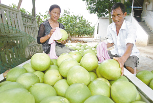 | 7月28日,澄迈县金江镇农民收获无籽蜜柚。