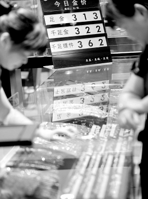 随着国际金价明显下跌,国内市场的黄金首饰价格也大幅下调。7月国际现货黄金价格共下跌62.65美元,跌幅为5.04%。国内现货金价7月每克下跌15.81元,跌幅超过5.8%。图为一名顾客(右)在海口某珠宝店挑选金饰。 新华社发