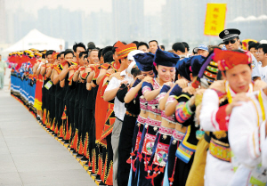 8月3日,在世博园庆典广场,广西115名身着少数民族服饰的演员脚踏50.6米长的板鞋向前行走。 当日,上海世博会广西活动周的主办方给参观者带来了一双“世界最长板鞋”,该板鞋共23节,总长50.6米。 新华社发
