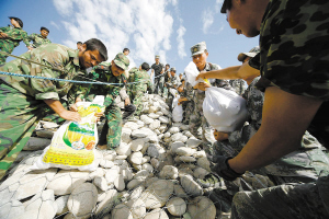 新疆和田县拉依喀乡夏合力克村喀拉喀什河防洪大坝出现120米溃堤险情。8月3日,和田军分区官兵和民兵在传递沙石袋。 连日来,新疆军区和田军分区先后出动部队官兵1437人次、民兵1.43万人次,拉运土石料1.3万立方米,加固和田县拉依喀乡夏合力克村喀拉喀什河防洪堤坝;同时,转移受灾群众5729人,全力保障当地人民群众生命财产安全。 新华社发