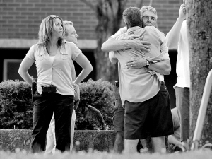 | 8月3日,在美国康涅狄格州曼彻斯特,工人和亲属在枪击事件发生后相互安慰。 新华社/美联 |