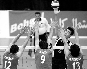 | 4日,在伊朗进行的亚洲杯男子排球小组赛中,中国队以2:3负卫冕冠军伊朗队,从而以2胜1负的战绩,列小组第二。崔建军的扣球也难挡中国队失利。 新华社发 |
