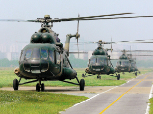 8月4日,济南军区某陆航团模拟“敌”救援直升机紧急起飞。 当日,“前卫—2010”防空部队大规模演练,全面展开“侦察预警”“信息对抗”和“对空抗击”行动,重点研究解决多手段获取信息、多途径传输信息、多方式融合信息、多方法组织信息防护以及昼夜间对空抗击的战法等问题。 新华社发