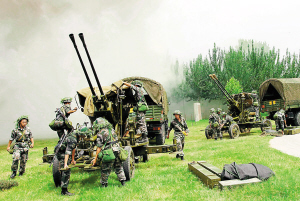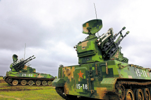 | →8月5日,济南军区某防空旅自行火炮快速进入阵地后展开演练。
