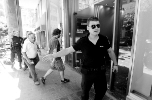 8月5日,在希腊首都雅典,警察指挥疏散工作人员。希腊财政部5日中午遭受炸弹威胁后紧急疏散。但警方随后没有发现爆炸物。 新华社发