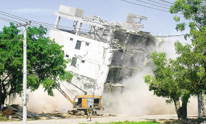 | 8月5日上午9时59分,三亚市解放四路西延线路边一幢12层的小产权房被拆。当天,三亚共拆除10幢小产权房,拆除总建筑面积近2万平方米。