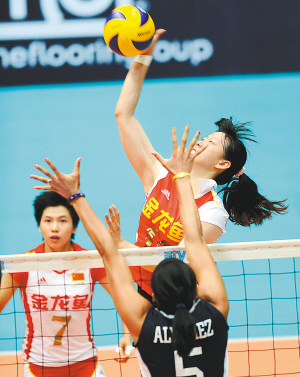世界女排大奖赛 中国完胜波多黎各 8月6日,在2010世界女排大奖赛成都赛区的比赛中,中国队3:0完胜波多黎各队。图为陈丽怡(右)在比赛中扣球。 新华社发