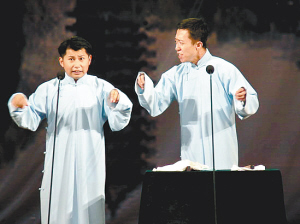 | 何云伟(左)李菁在表演相声 |