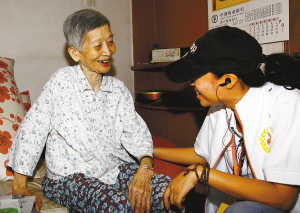 8月7日,在海口市侨中里社区,省红十字会的志愿者正在陪85岁的潘惠忠老人聊天。当天省红十字会“天来泉·夕阳暖”行动正式启动。“天来泉·夕阳暖”行动由省红十字会天来泉老年健康基金支持,主要对老年人开展生活照料、心理慰藉、医疗保健、法律援助、应急帮助等关爱活动。 本报记者 林萌 摄