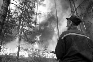 | 一名男子在俄罗斯穆尔米诺村附近灭火。 (法新)