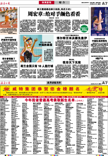 海南日报 体育新闻综 合 007 2010-08-081 2010年08月08日 星期日