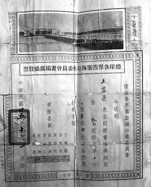 1931年上半年,王尊荣升任琼山县建设局局长。1936年,王尊荣还是“琼崖各界筹筑海口港委员会”的常务委员之一,而他本人当时也出资12个大洋入股。王学桃现在还收藏着其父留下的一张股票凭据,凭据之上有“琼崖各界筹筑海口港委员会书场码头股票”的字样。