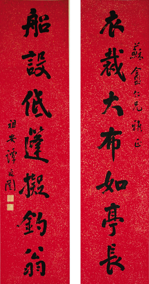 谭延闿早期曾模仿刘石庵,中年专意钱南园、翁松禅两家,晚年则参米南宫。他的行书将刘石庵与钱南园相互熔于一炉。其点画之丰满圆润、挥洒从容乃似石庵,而浑健苍劲,体势阔疏朗,气势夺人处又似南园。“谭延闿是进士出身,入翰林院,有很高的学养。能巧妙地从前人书中吸收营养,从而形成了自己宽博温厚、含蕴性灵、雄健开阔的韵致。此对取自陆游诗《戏咏村居》,此联中谭延闿放低姿态,在友人面前表现了一种谦恭。”李有骨说。