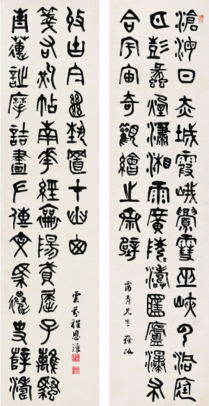 其实据史料考证,这对龙门对的原创者乃明代诗人李东阳:“沧海日,赤城霞,峨嵋雪,巫峡云,洞庭月,彭蠡烟,潇湘雨,广陵潮,匡庐瀑布,合宇宙奇观,绘吾斋壁;青莲诗,摩诘画,右军书,左氏传,南华经,马迁史,薛涛笺,相如赋,屈子离骚,收古今绝艺,置我山窗。”这副《题书斋联》历来被誉为是奇联绝对,联中绝唱,在中国楹联史上产生过很大的影响。而后,清代大书法家邓石如对《题书斋联》内容略有修改,将其与书法结合在一起创作了龙门对,自此盛传不衰。到了程恩泽,更是将书法艺术发挥得琳璃尽致,又赋予这幅龙门对书法价值。