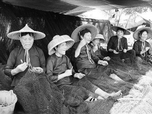 | 临高新盈港渔家女人边补网边唱渔歌。于伟慧 摄 |