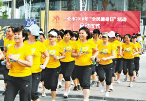 本报三亚8月8日电 (记者郭景水 实习生石挺恋)今天是全国第二个“全民健身日”。上午,三亚市直机关、旅游系统、教育系统、政法系统、卫生系统的干部职工、中小学生、医护人员以及体育社团的运动爱好者、驻地部队官兵千余人身着运动休闲服装(左图,郭景水摄),在市内进行跑步,倡导全民健身。