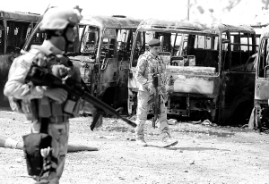 | 八月八日,伊拉克士兵在巴格达发生爆炸的停车场检查。 新华社/法新 |