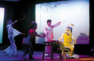 值得一提的是,《狼孩》一剧将以往躲在幕后操纵木偶和皮影的表演形式进行了改革,特地将演员调度到了台前,形成了人偶同台的艺术效果,将人、偶、皮影、多媒体有机结合,进而大大增强了全剧的艺术性和娱乐效果。