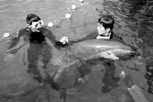 | 两位救助人员正在为患肺炎的海豚做治疗。 本报记者 苏晓杰 摄 |