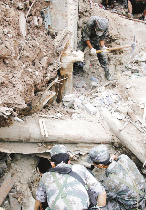 ↑8月10日,舟曲县城关镇北街村,兰州军区某团官兵正在居民区废墟中寻找幸存者。本报记者 李英挺摄