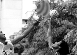8月11日,在省第四届少数民族传统体育运动会珍珠球比赛中,海口队和三亚队激烈拼抢。 本报记者 宋国强 摄