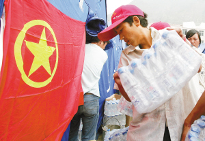 ③8月11日,共青团团员志愿者给安置点的群众送水。
