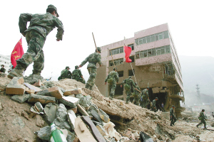 ④8月11日,兰州军区救援队获悉前面废墟有生命迹象,紧急冲向现场。