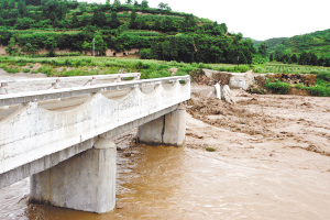 | 8月12日,甘肃成县洛河一艘采砂船撞毁成县店村镇大寨村通往张寨村的水泥桥。 新华社发