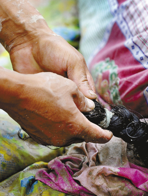 8月12日,韩如栋为女儿编辫子。 当日,救援人员将遇难的8岁女孩韩璇从5米多深的淤泥中挖出,其父亲韩如栋用清水将女儿清洗干净后,又为女儿最后一次编辫子。 在甘肃省甘南藏族自治州舟曲县“8·7”特大泥石流灾害中,韩如栋的家被泥石流冲毁,其父母、妻子、女儿、弟妹等9人遇难或失踪。 新华社记者陶明摄
