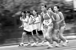 ← 在省第四届少数民族传统体育运动会板鞋五个项目的比赛中,琼中队获得了“男子60米”、“女子100米”和“200米混合接力”三项冠军。图为板鞋200米男女混合接力决赛。