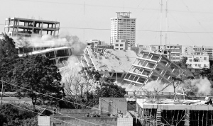 | 8月5日下午,紧邻海口美舍河大桥的13栋违章建筑瞬间夷为平地。为了打击违建,海口市政府牵头、龙华区政府组织了此次对违法建筑的定向爆破拆除。本报记者 李英挺 实习生 李健 摄