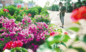 | 8月12日,在海口花卉大世界里,工人正在浇花。 本报记者 张杰 摄 |