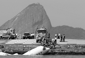 8月12日,在巴西里约热内卢国际机场,救援人员试图将一架冲入海中的小型客机拉上岸。这架客机降落时冲出跑道坠入海中,所幸机上3人及时获救。 新华社/路透