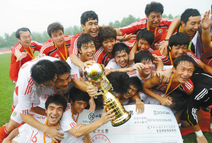 8月13日,在山东潍坊进行的“潍坊杯”国际青年足球邀请赛决赛中,中国国青队以3比1战胜天津泰达队,夺得冠军。图为国青队球员庆祝夺冠。 新华社发