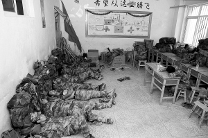 | 8月14日,为了减轻灾区群众负担,救援官兵躺在水泥地上睡觉。
