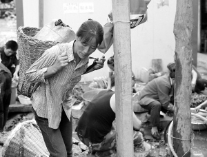 背着水行走非常艰难,但大家脸上的表情都很从容。硕大的背篓压在个头矮小的女人身上,仿佛一座小山。这时,三、四名解放军战士拉着一辆运砖小车经过,队伍里的杨海菊立即上前帮忙推车。