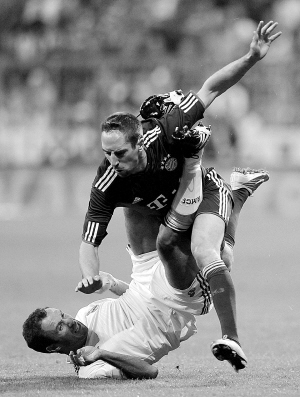 8月14日,在慕尼黑安联球场举行的第三届贝肯鲍尔杯足球赛中,皇家马德里队通过点球大战以4比2战胜拜仁慕尼黑队,捧得奖杯。图为皇马球员卡瓦略(左)与拜仁球员里贝里争抢。 新华社发