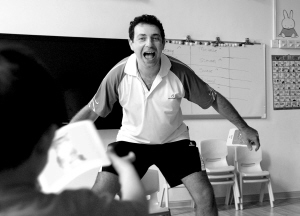 教孩子们有趣地玩,是他的特色教学方法,在玩中不知不觉地进入英语学习。他会用图片,歌曲,动画片,游戏等事物来让孩子们学英语。比如他给孩子们放动画片,当画面上出现了老虎时,他就暂停下来,告诉孩子们这是老虎———tiger。为了让孩子们记得更加牢固,他甚至会不顾自己的形象,趴到地上学老虎叫。