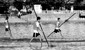 脚踩碗口粗的竹子,持细杆划水行于河中,在竹上表演仰卧起坐、俯卧撑、蝎子摆尾等一系列花式动作。近日于三亚举行的海南省第四届少数民族传统体育运动会上,6名初中生在三亚河上表演的独竹漂“水上轻功”,引来一片叫好声……