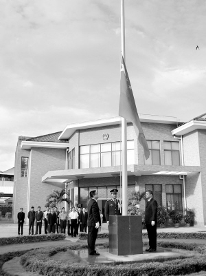 8月15日,在柬埔寨首都金边,中国驻柬埔寨大使馆全体馆员参加使馆下半旗志哀仪式,悼念舟曲特大山洪泥石流遇难同胞。