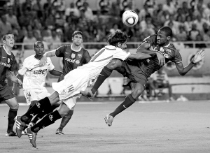 | 15日,在西班牙超级杯决赛首回合比赛中,巴塞罗那队客场以1:3不敌塞维利亚队。图为双方球员在比赛中争抢。