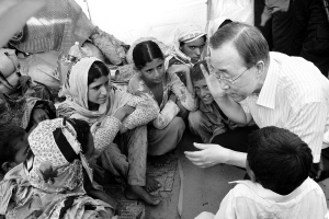 8月15日,联合国秘书长潘基文在巴基斯坦一个国际难民营和灾民交谈。 新华社发