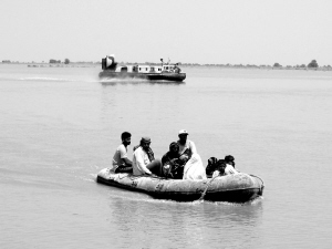 8月15日,在巴基斯坦苏库尔,灾民离开被洪水淹没的家园。新华社发