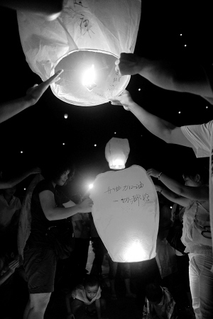 放飞孔明灯前,全场300多人举行默哀仪式,以表达对舟曲遇难同胞的深切悼念之情。