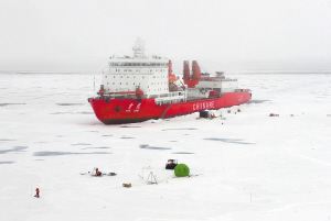 这是8月16日,在空中航拍的中国第四次北极科学考察队建立的“长期冰站”,建在北纬86度55分。 在北冰洋海冰上建立“长期冰站”进行海洋、大气、海冰的联合作业考察,是我国每次北极科学考察的重要任务。 新华社记者 张建松 摄