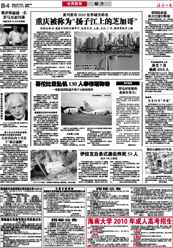 海南日报 世界新闻综 合 012 2010-08-181 2010年08月18日 星期三